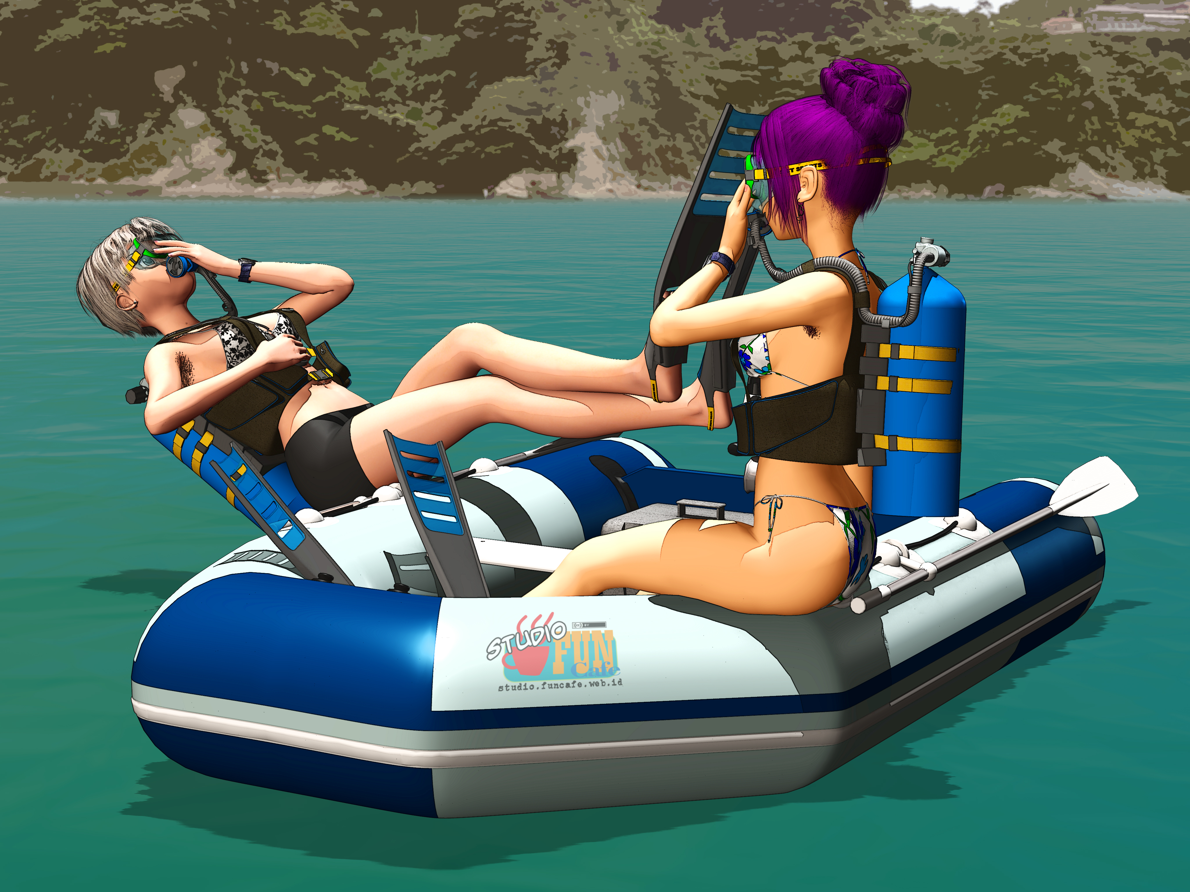 There are various entry methods in diving, one of which is the backroll entry. This method is often used when a giant stride entry is not possible, such as when entering from a small boat. To perform a backroll entry, a diver sits on the very edge of the boat hull, with one hand on the goggles and the other hand on the regulator or behind the head. After making sure there's no obstacles behind, lean back, pull legs toward the body and splash down. Today, our girls will performing this method since they are onboard a dinghy. One has already performed her backroll entry, while the other is watching and waiting for an OK sign before performing her backroll. With their careful and calculated performance, there's nothing to worry about.
