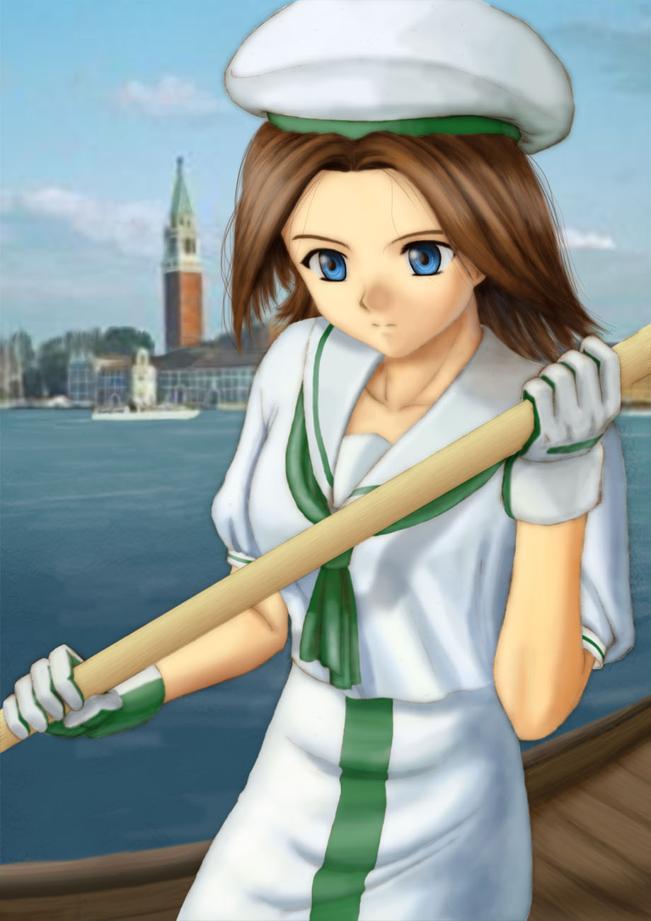This may called double fanart, a fanart of a fanart. The original idea of placing Rin as Undine can be considered a fanart, so a fanart of that Undine Rin might be called double. Confused right? Frankly, I've never thought that someone could make Rin so cute like this, it's beyond my imagination as the chara designer. Rin image has changed many times since created, from exact personality copy of Aya, a cool girl and now become cute teenager as I did in the latest revision. This fanart really captured the image that I want to see from Rin. Cute, but still cool. Anyway regarding the uniform, actually my uniform design has 2 stripes, but I think it's okay making it just one. Also I agree with the idea of removing the shirt pocket, looks better like this. One more thing, Rin eyes supposedly cyan colored like duck egg, seeing her in aquamarine blue makes her looks kindy scary, ne?