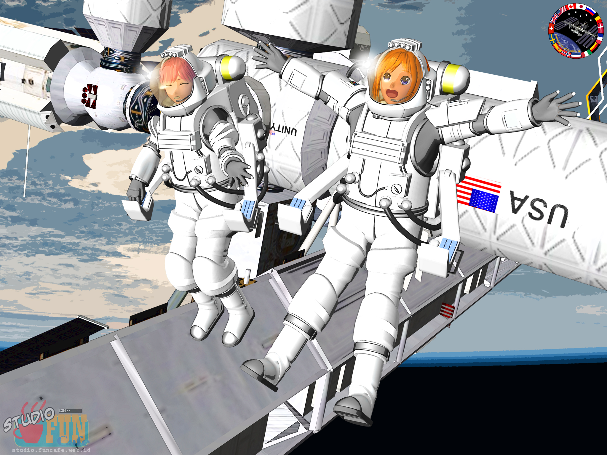 | Title: Zero Gravity Strolling Finished: July 15, 2020 "Look, how happy she is!" The long awaited spacewalk scene. Initially, I used the ISS model from NASA, but it was too detailed since it had very high polygon counts and almost crippled my computer. So, I replaced it with a lower polygon model. I think it's OK since I was doing cell-shading style anyway. |