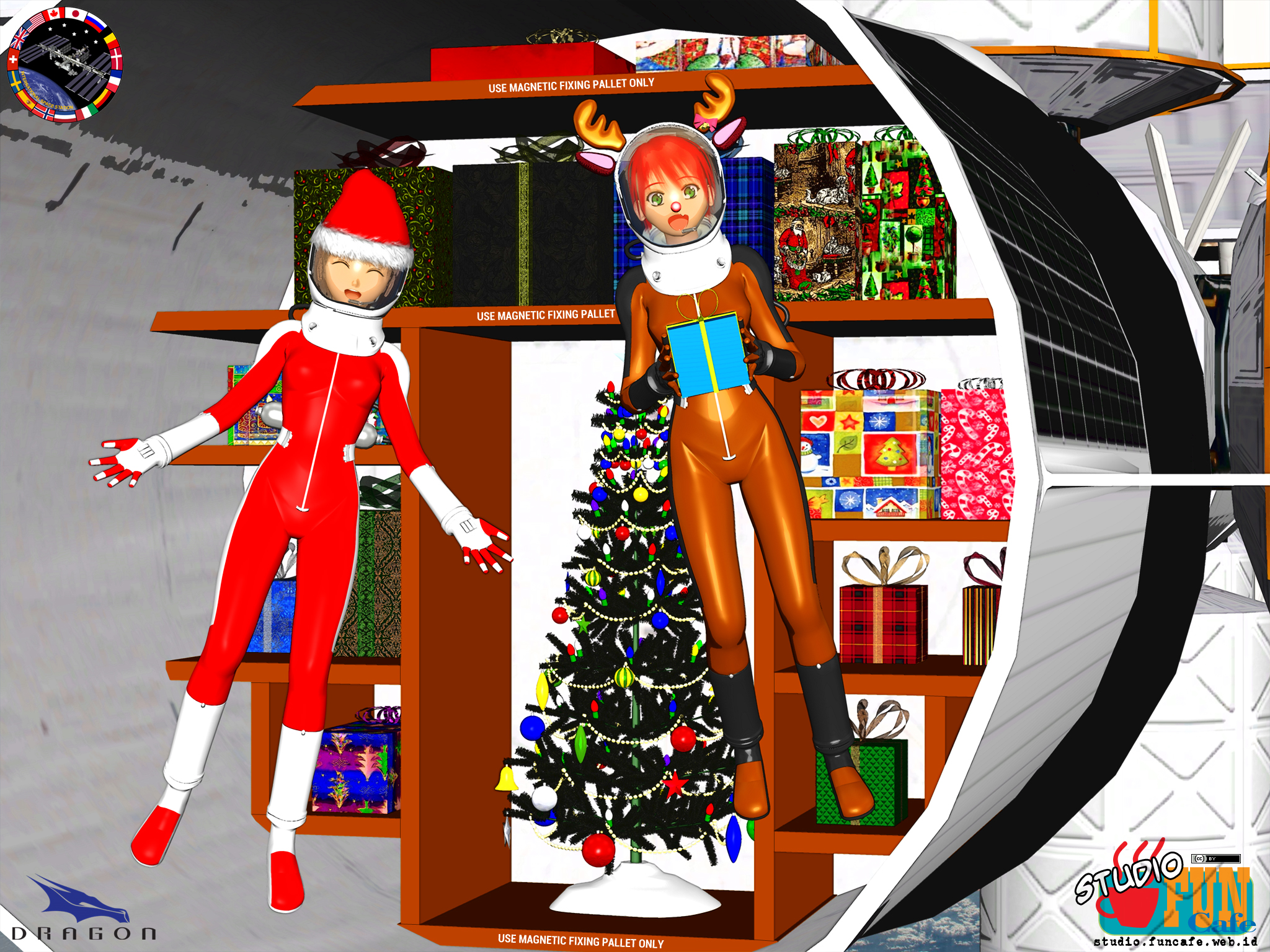 | Title: Zero Gravity Sleigh Finished: Desember 17, 2020 You better watch out You better not cry You better not pout I'm telling you why Santa Claus is coming to station Santa & Rudolph have came to ISS using Crew Dragon as sleigh. The decoration was assembled in orbit, there is no way it survive during the launch process. The shelf and the parcels has magnetic fixing so the parcels can be adhered to the shelf. |