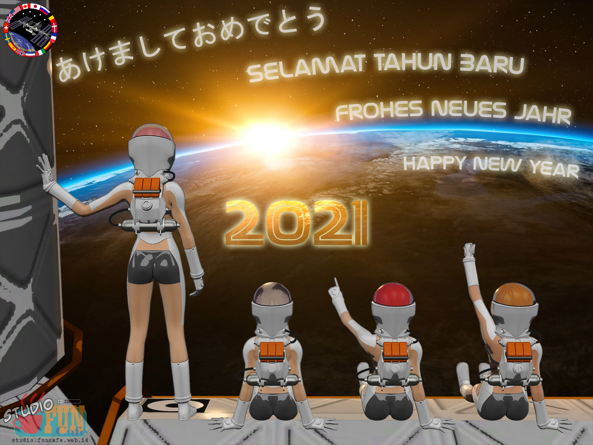 The 2021 New Year greeting card featuring all the girls on vanity spacesuit.