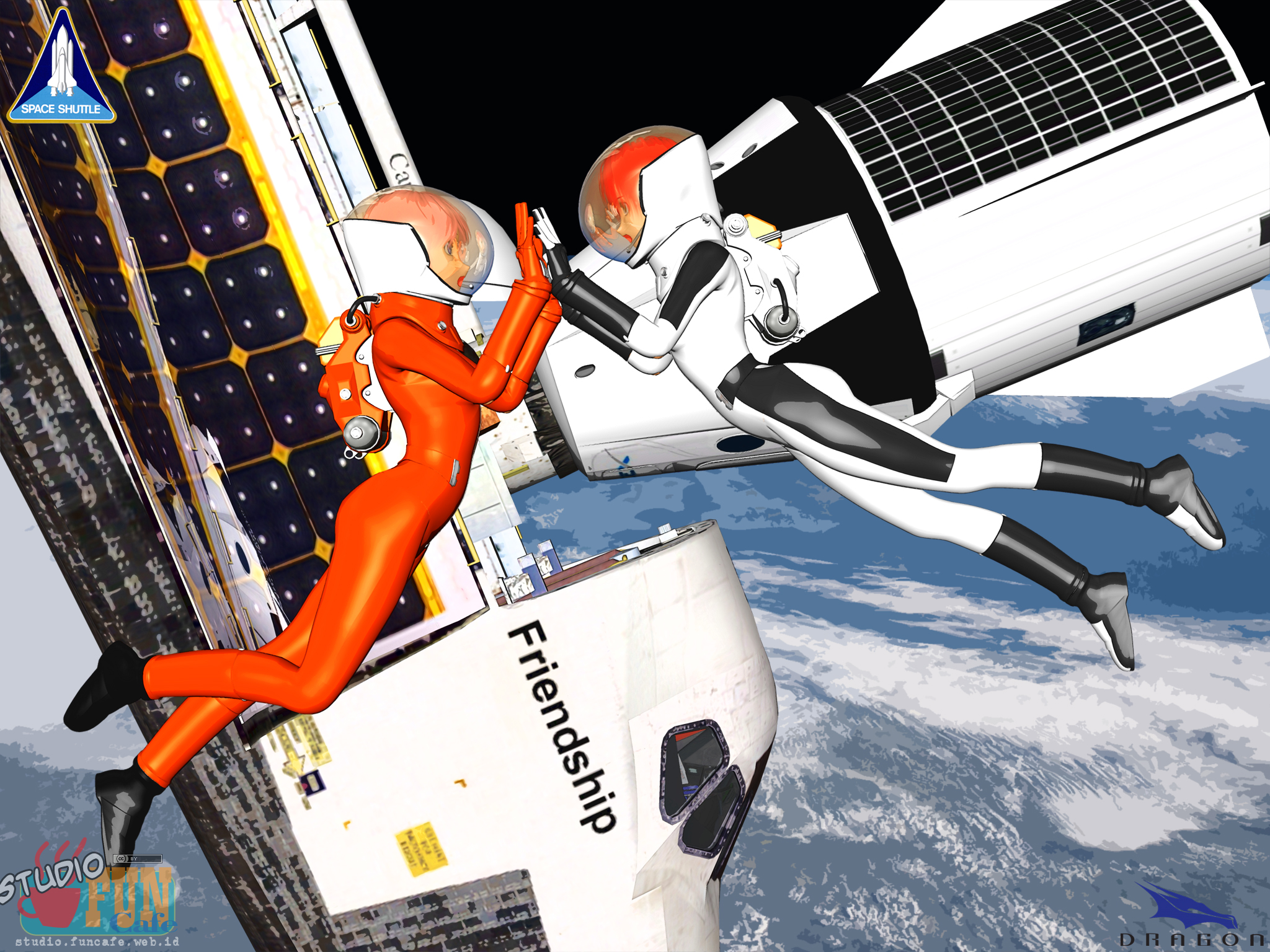 The glorious spacecraft of yesterday meets the promising spacecraft of today. It is nice if this could happen. The orange scheme spacesuit was based on Shuttle launch suit theme, while the white spacesuit was based on Dragon launch suit theme.