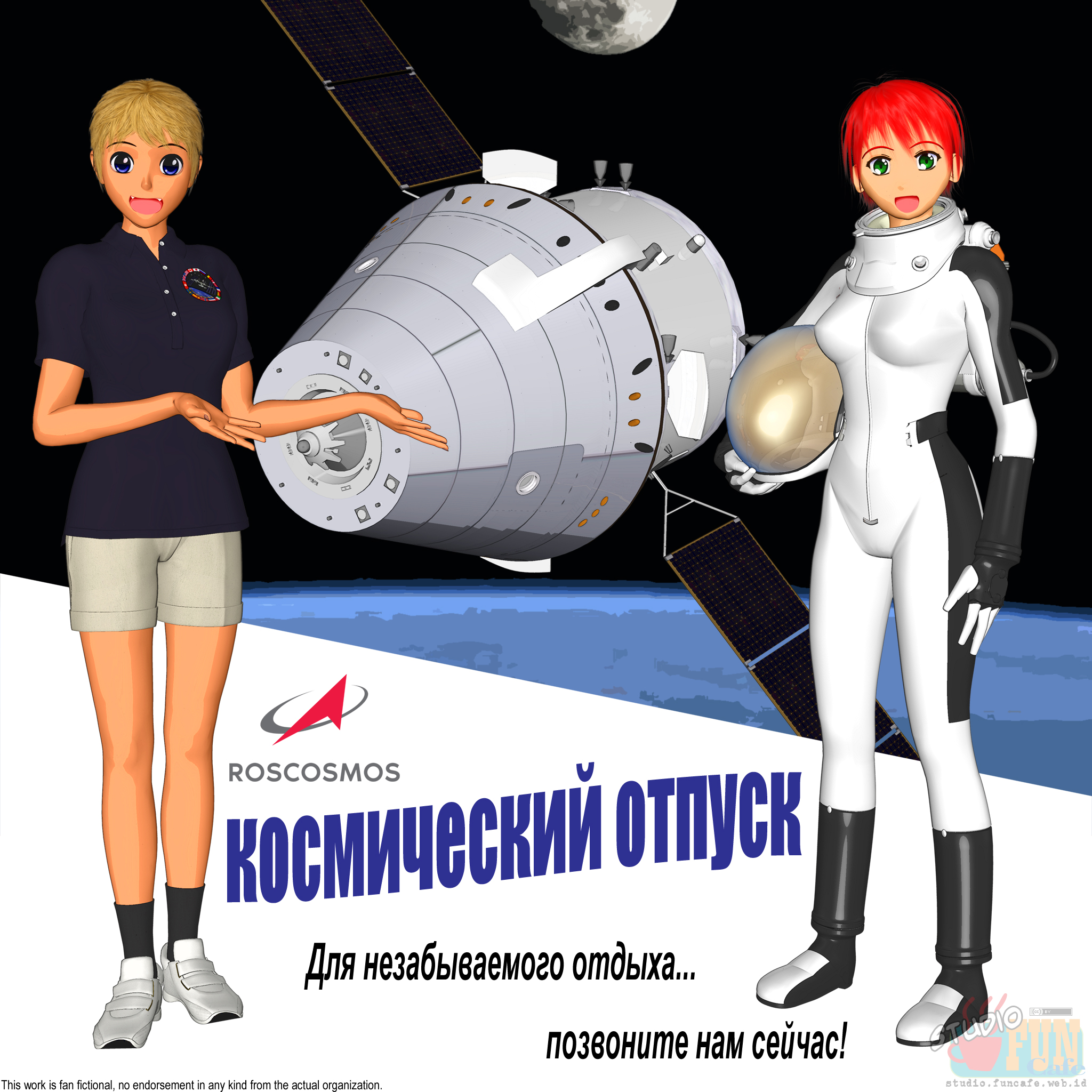 In the (fictional) future, we expect that space tourism industry will be flourished. We expect that technological advances and economic scale will give everyone access to the space. This is a fictional brochure of space tourism from Russian space agency. It was the Russians who started space tourism and it is natural that they will be the leader of this industry in the (fictional) future.
