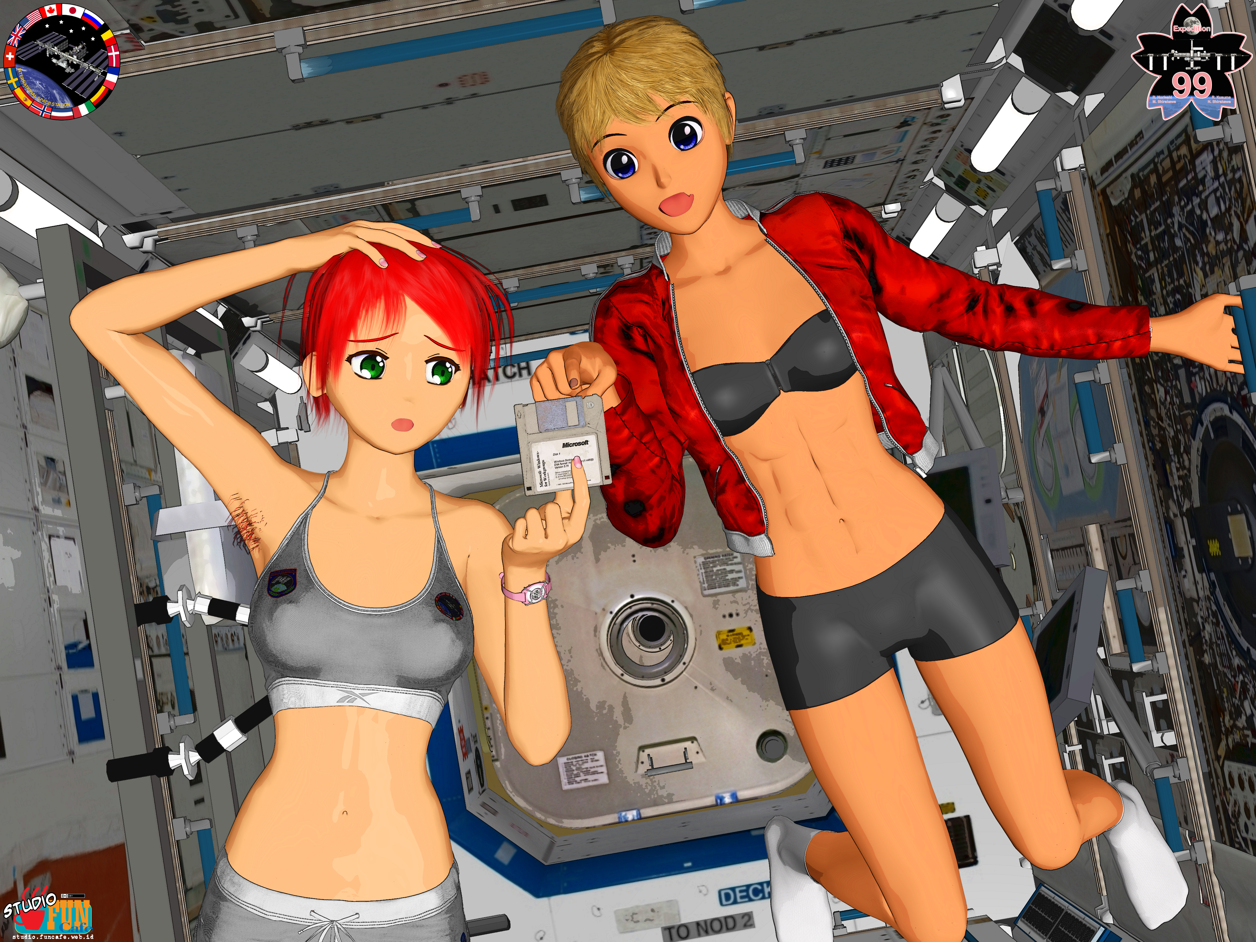 | Title: The Relic of The Past Finished: June 07, 2024 The ISS was constructed decades ago. It was the amalgam of space age technology and loaded with the most current technology back then. Today, decades later, the state of the art technology back then has became obsolete. Some of the technologies may no longer be used by today. Recently, astronauts found a set of floppy disks floating around at ISS. It is nice to see relics of glorious old era appear again like blast from the past. In the future (fictional ) ISS, our girls have found a very old treasure hidden in their workplace. These girls, who are born as millennial generation, probably never seen a working floppy disk before. It is surprising yet exciting to found the historical relic, a silent witness to the development of the ISS. |